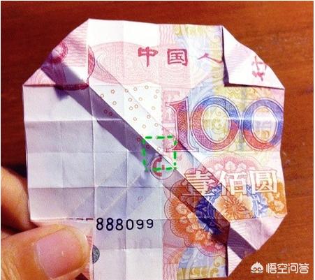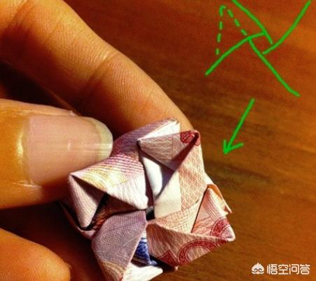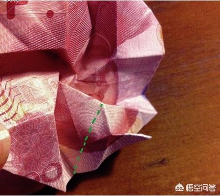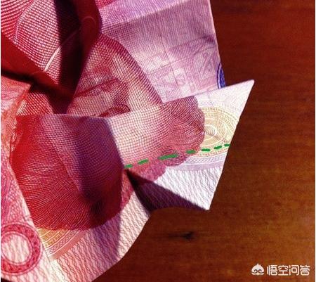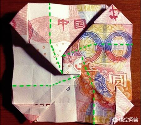 10、沿着绿线的位置,捏出一个呈直角的L形折痕。钱的角那里,要展平。