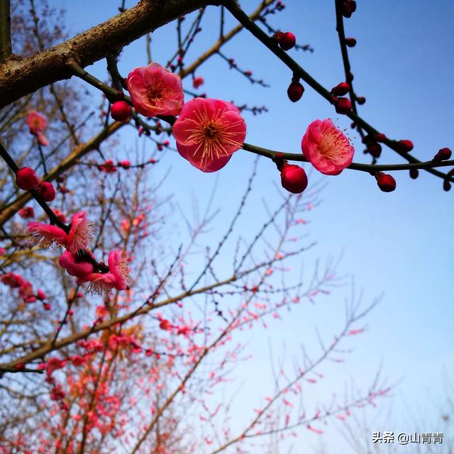 春梅:晴朗的天气,雨后初晴最好,时段要尽量避开光线强烈的时段。江淮之间春梅一般在四月底五月初,全部怒放,农历春末夏初的时候,这个季节的阳光开始不那么温柔了,中午前后,光线强烈,会给拍照带来不少麻烦,除了相机曝光要重新设置,强烈的光线带来明显的阴影这也是个麻烦,上午天亮后至九点前,下午四点后,这段时间光线相对柔和,好把握。