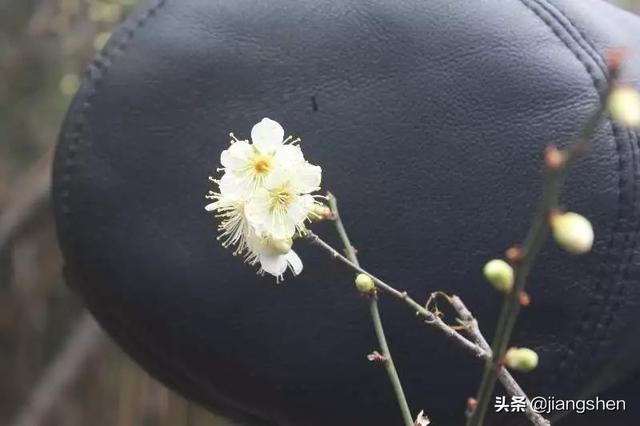 我是这样拍摄梅花的:用一顶黑色皮帽做被摄梅花的底板(右图一),然后将拍好的照片后期处理(中),最后进行美图处理(左一)。