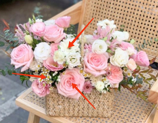 4. 在主角花周围逐渐加入其他小型鲜花,注意要保持整体平衡感。可以根据颜色搭配原则来选取不同颜色和形状的鲜花进行组合。