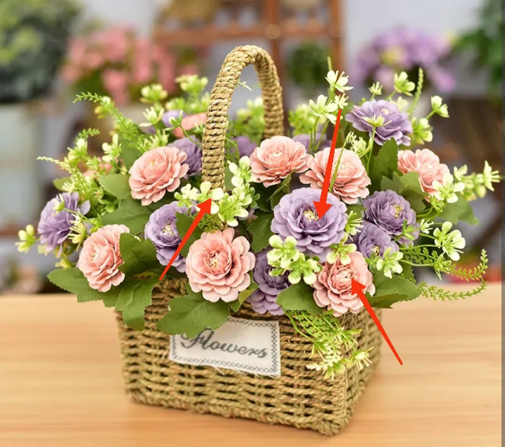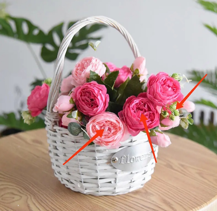 5. 最后,在空隙处填充一些叶子或者枝条等绿植素材,使整个花篮更加丰满有续。