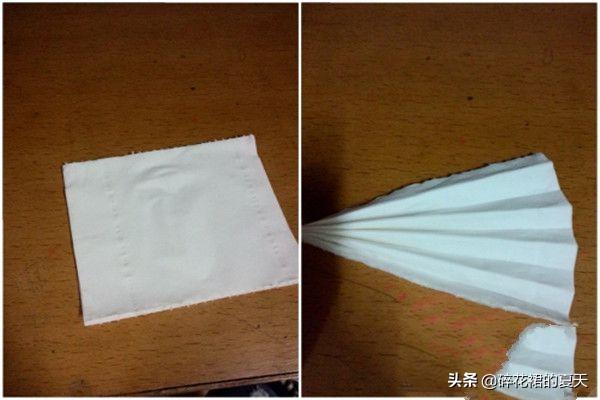 第一步:将餐巾纸展开,然后对折两次,使其成为一个小正方形;