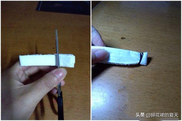 3由于做花不需要这么长,所以我们要拿剪刀减去多余的部分,大约就是卫生纸的三分之一,用皮筋固定住。