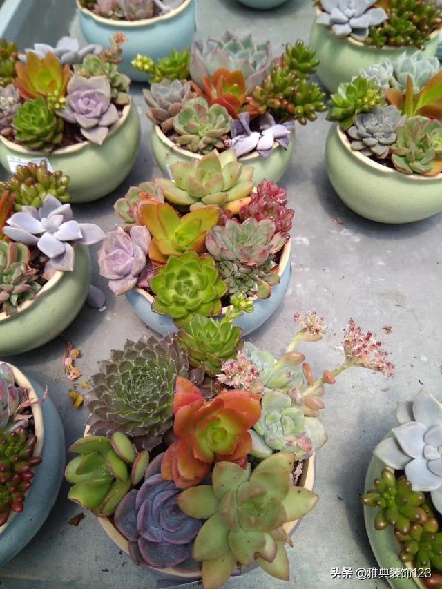 许多多肉都长得胖嘟嘟,色彩又多,拼成盘颜色也丰富。而且多肉盆也形状奇特,再配一点点小装饰物,特别讨人喜欢,老师见了心情会大好!