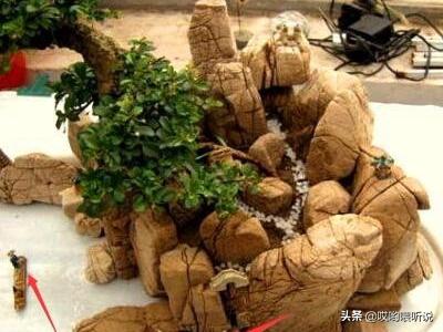 7、花盆内留白处可以放1-2个点缀物,要切合主题,不能过多,像老翁钓鱼,泛舟等都是不错的创意。一盆个性的山水假山盆景大功告成。