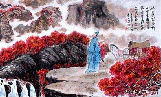 这是一首描写和赞美深秋山林景色的七言绝句。第一句:“远上寒山石径斜”,由下而上,写一条石头小路蜿蜒曲折地伸向充满秋意的山峦。“寒”字点明深深秋时节;“远”字写出山路的绵长;“斜”字照应句首的“远”字,写出了高而缓的山势。由于坡度不大,故可乘车游山。