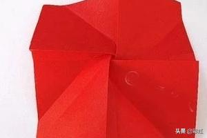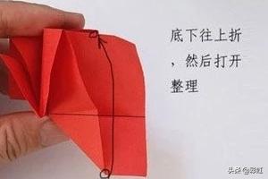 11、将底部向上进行折叠,即如折纸图示所示进行折叠操作。在完成之后就可以开始对这个手工折纸玫瑰进行整形了。整形的重点实际上就是在折纸玫瑰的花瓣处进行一些折叠整理。最终是否在效果上真正的变得好看了,还在于你的整形功力哦。