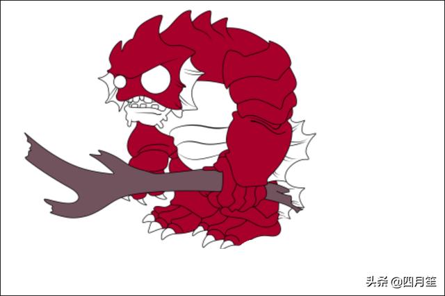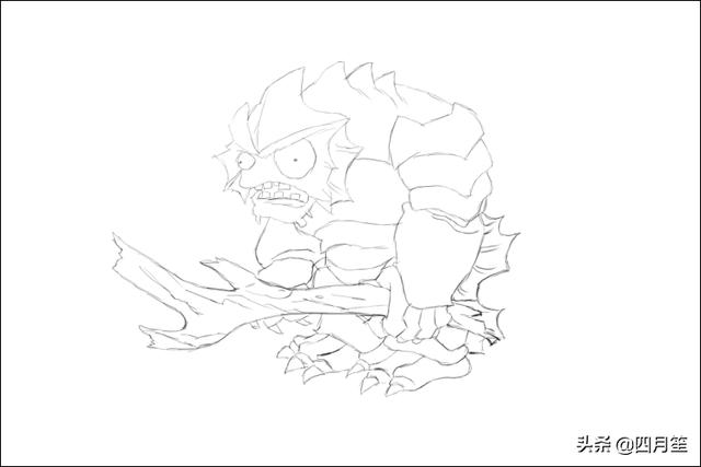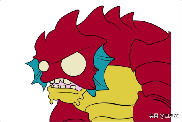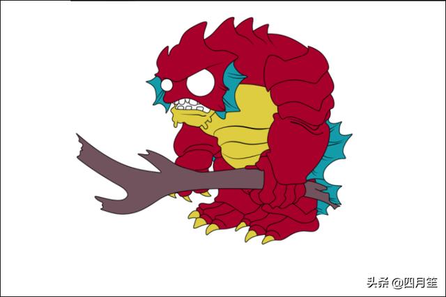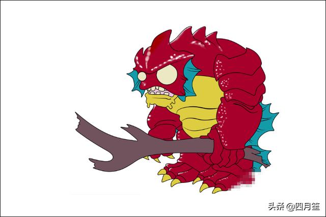 7 选用深色对深海巨人身体的轮廓涂上阴影色;给眼珠点上黑色,给巨人手持的木棍画上纹理;选用淡白色对整体添加甲壳表面的高光。 植物大战僵尸深海巨人绘制完成。